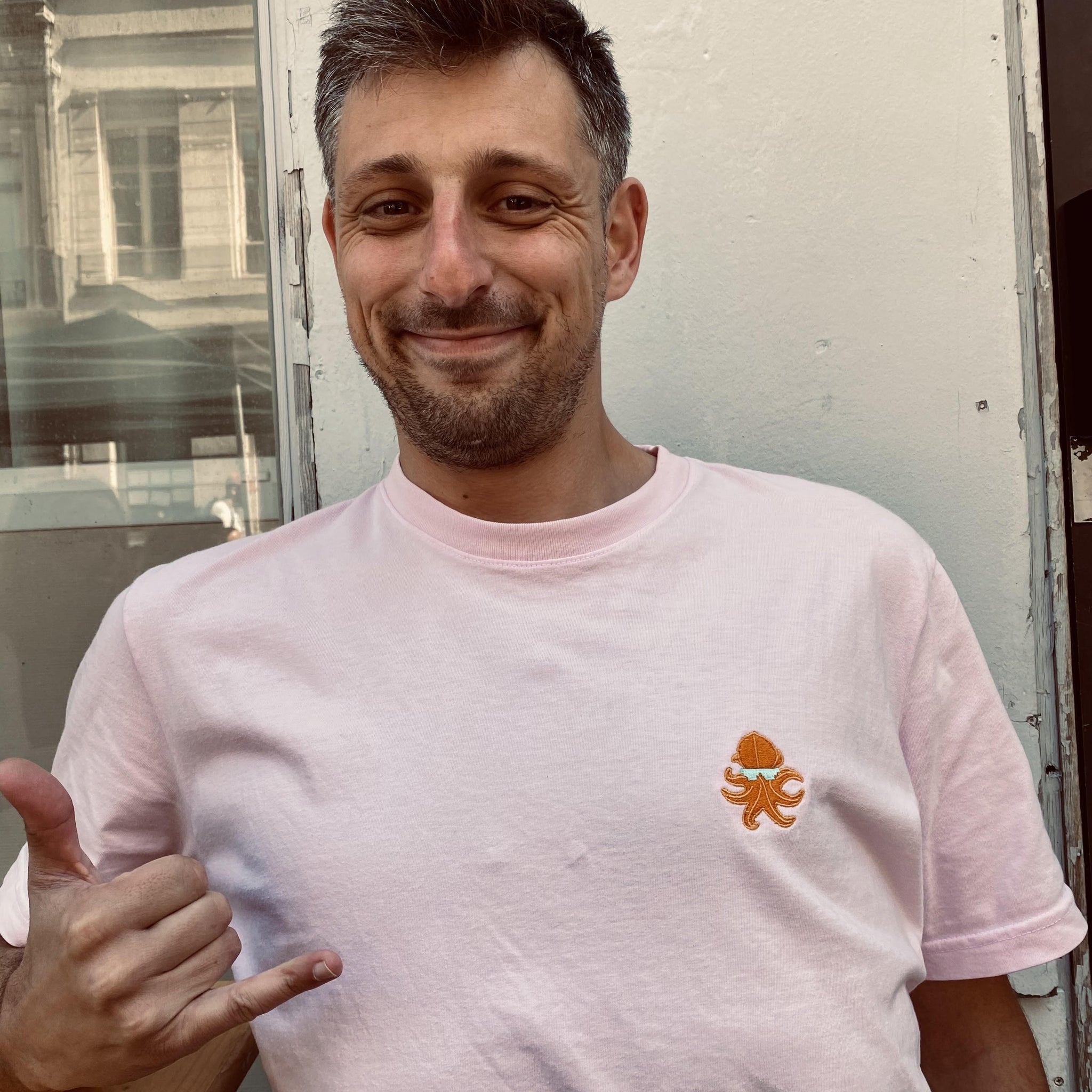 Phosphorescent - T-shirt rose à col rond et coupe droite. Attaché aux ports de Marseille et Miami, le poulpe gangsta vit la thug life en rébellion contre la pollution des océans. Il n'a qu'une revendication : stop au plastique! Brodé sur un vêtement en coton organique, le poulpe a pris vie loin des fibres synthétiques, ces particules microplastiques qui empoisonnent la faune marine.